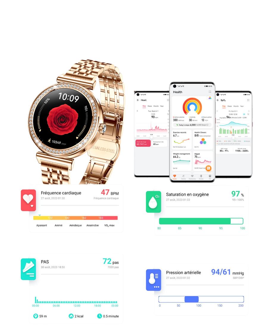 La montre Jouvio Cristal, c'est votre coach de santé personnalisé directement à votre poignet.