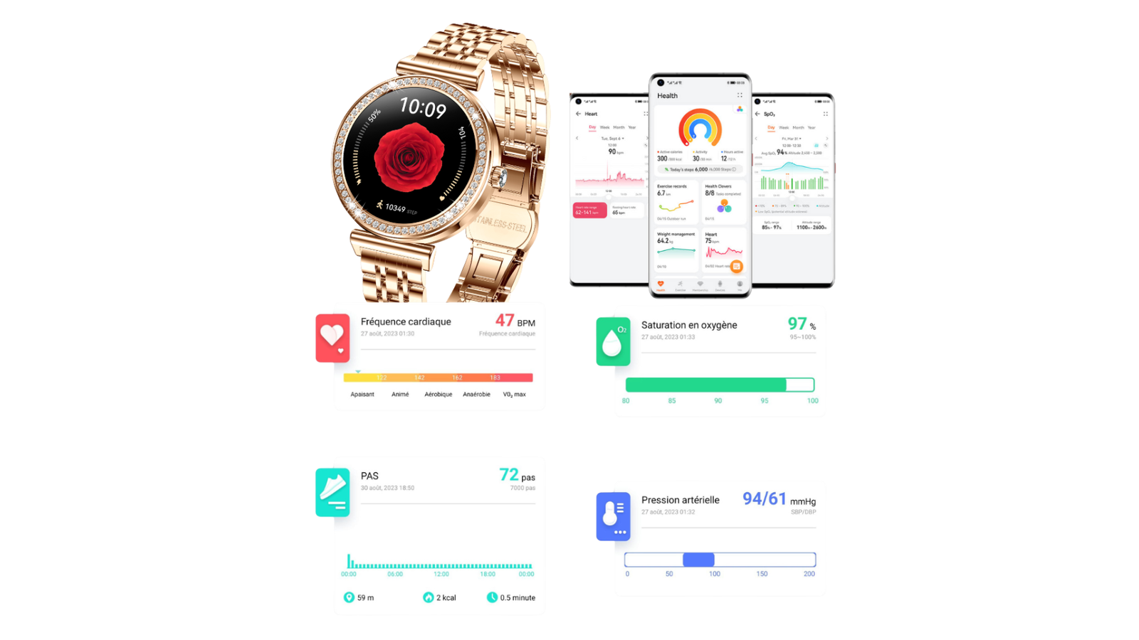 Compteur de pas, fréquence cardiaque, fréquence cardiaque à la journée, pression artérielle, saturation en oxygène, rappel d'hydratation